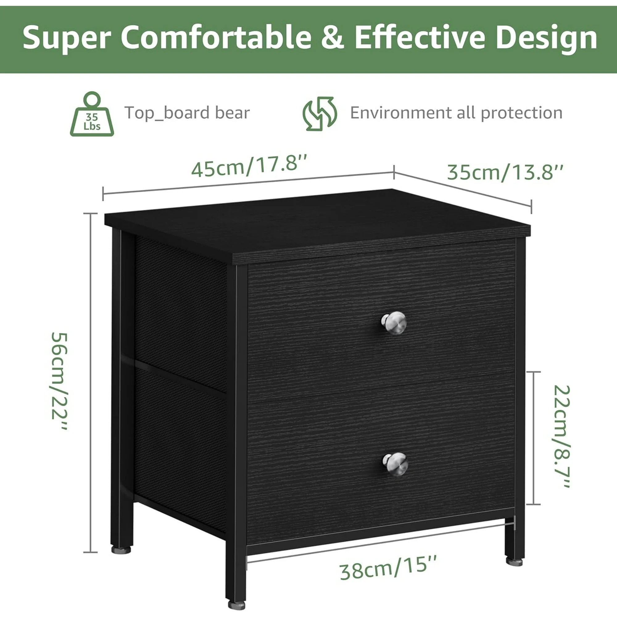 • Fabric Drawer With Wood Front: This black night stand has FABRIC drawers with wood front,elegant look and easy to clean,removable wooden handle. Could be a nice small piece of furniture to be placed in easy-look place