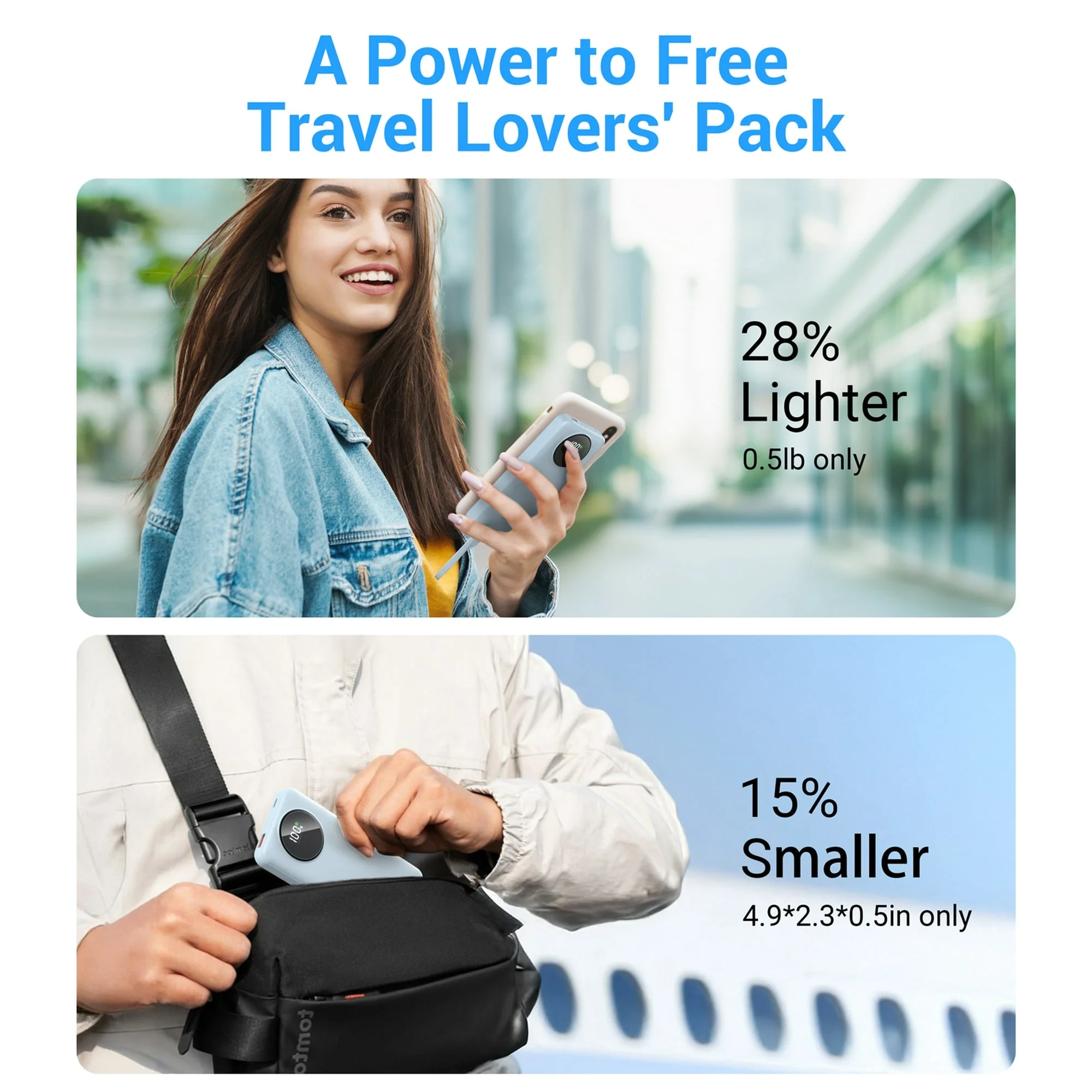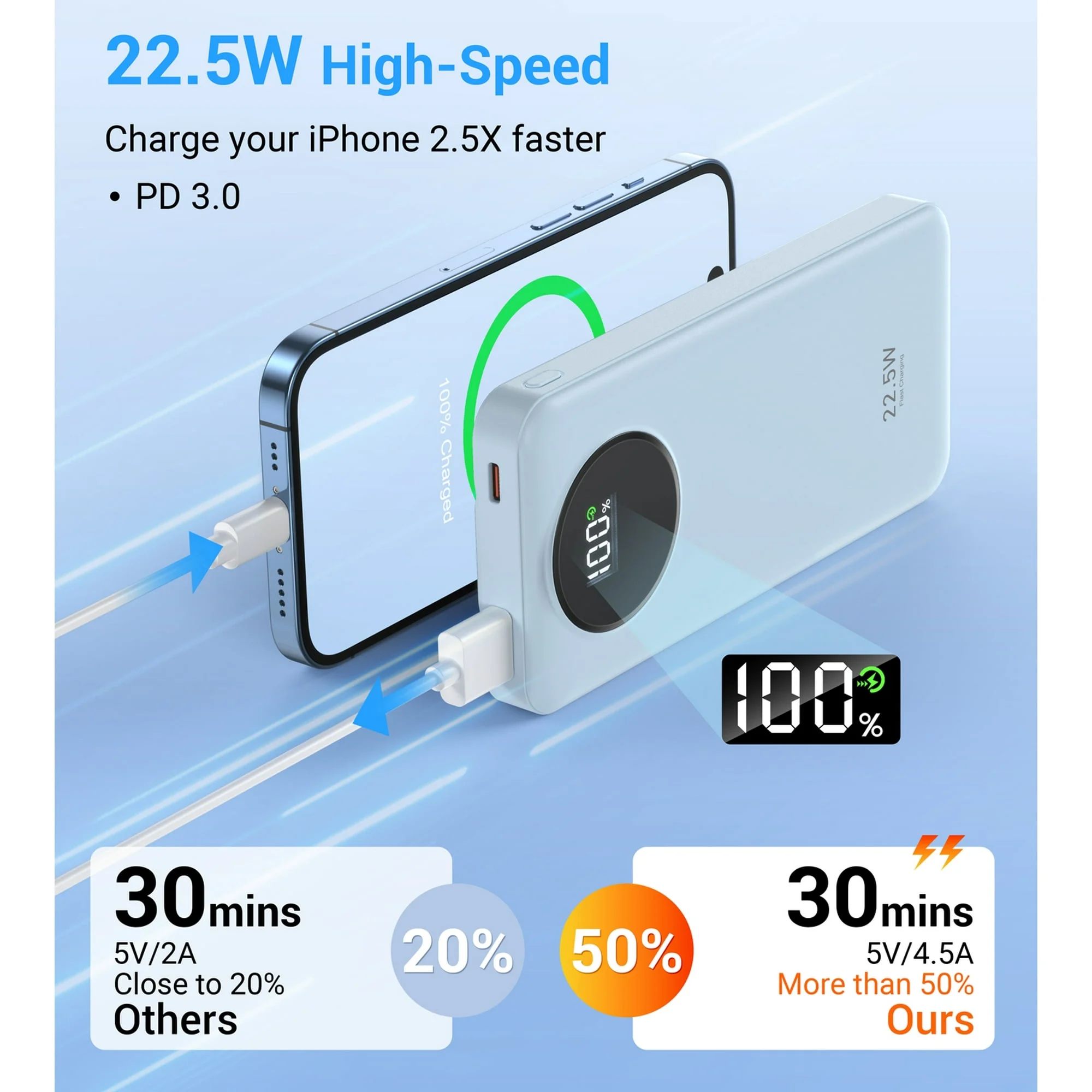 - 【22.5W Fast Output & LED Power Display】The Type-C output cable and USB output port of the portable phone charger use PD 22.5W fast charging technology to quickly charge your device. The LED power display lets you know your power level clearly.