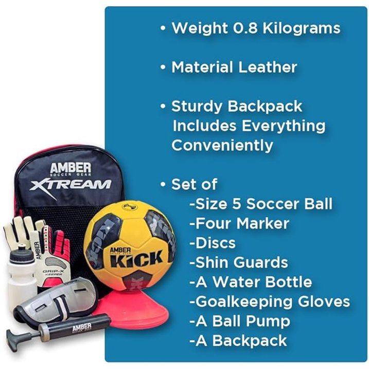 - Set includes: size 5 soccer ball, 4 pieces market discs, 1 pair of shin guards, 450Ml water bottle, 1 pair of Goal keeping gloves ball pump and a backpack. Soccer ball should not be inflated between 6 to 8lb.