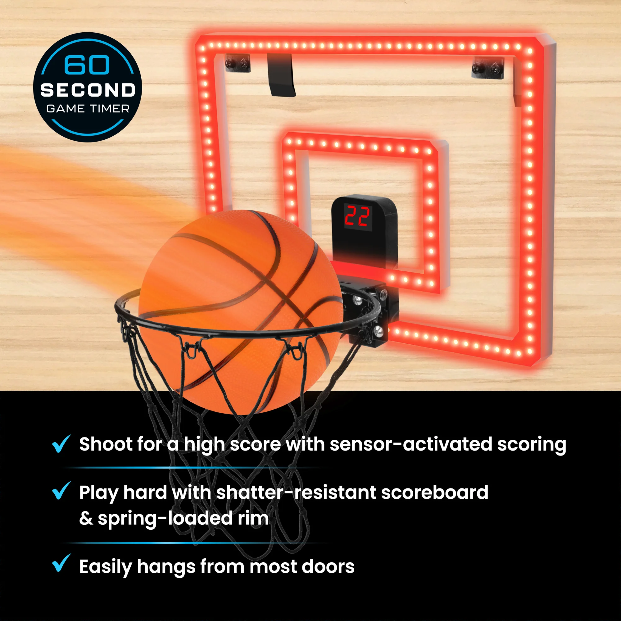 - LED FUNCTIONALITY: The battery-powered backboard lights up and flashes when a basket is scored!