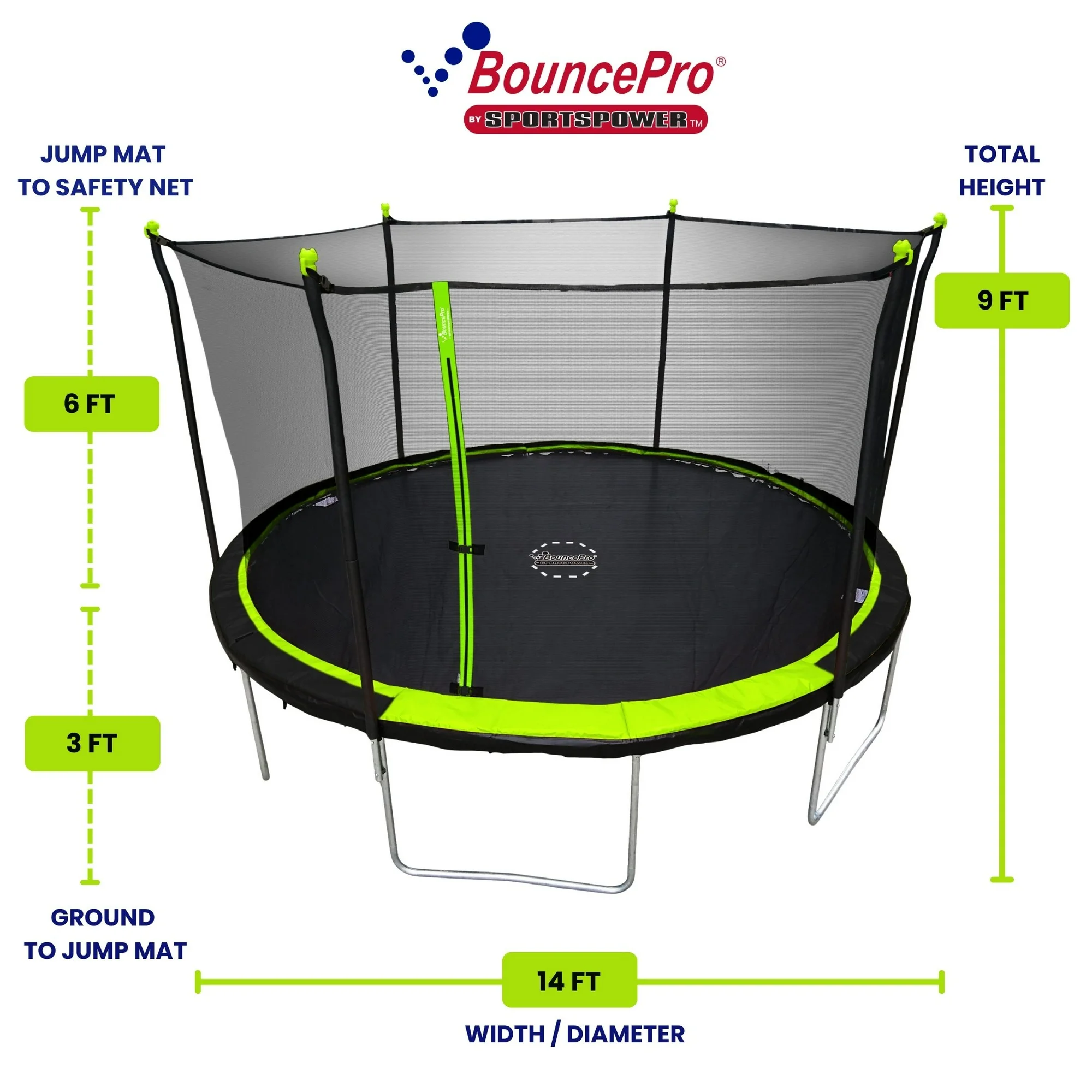 The ultimate addition to your backyard, the BouncePro™ 14’ Round Trampoline with Safety-Enclosure will turn your backyard into a hub of bouncing fun. Parents can rest easy watching their little ones have fun, knowing that safety is our priority. BouncePro™ trampolines are designed and rigorously tested to surpass ASTM safety standards, exceeding industry requirements by more than double the standard resistance. Our trampolines ensure unparalleled durability and stability, featuring a high-quality galvanized steel structure with patented double-welded plates on frame and leg connections. Made with UV-resistant materials, our jump mat, PE-coated spring pad protector, and 360-degree safety-enclosure netting are engineered to withstand the elements, ensuring ultimate fun and safety for many seasons to come. With over 20 years of industry experience, Sportspower™ manufactures outdoor play products at market-leading prices. Our US-based customer service team is always ready to assist. Jump into boundless excitement with America’s best-selling trampoline!