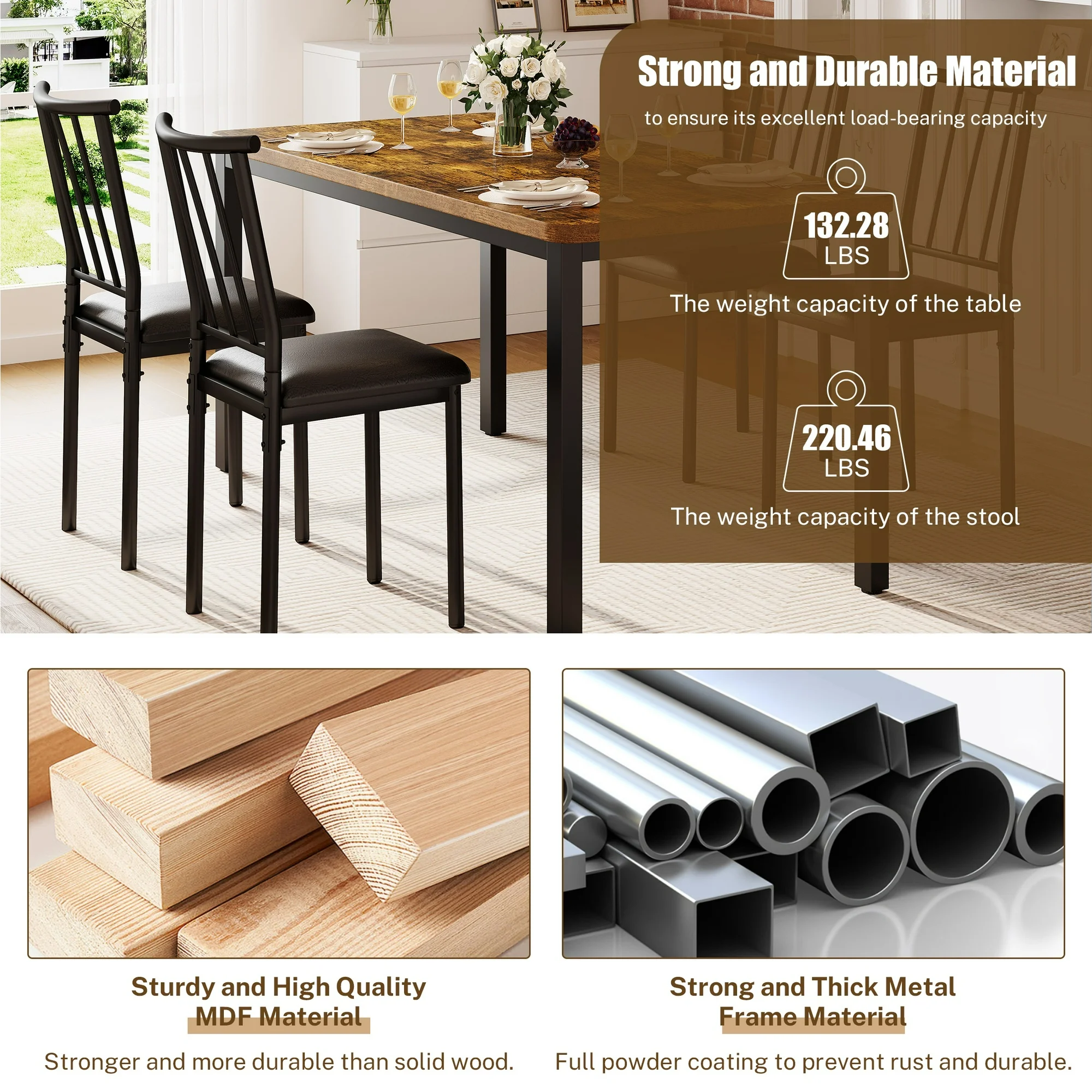 - Durable and Sturdy Construction – Crafted from high-quality materials, this dining set promises durability and reliability. The sturdy table can withstand daily use, while the reinforced chair frames ensure stable and secure seating. This set is built to last, making it a smart investment for both home and commercial settings.