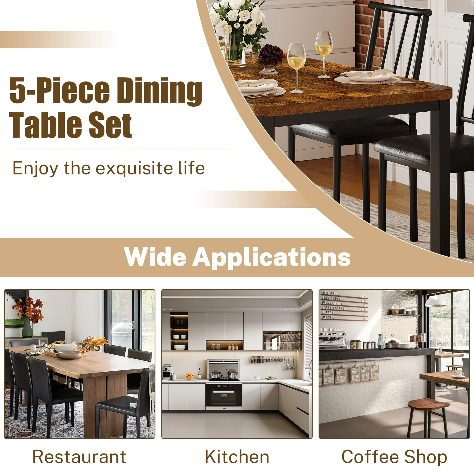 - Elegant and Modern Design – Transform your dining space with the UHOMEPRO 5 Piece Kitchen Table Set, featuring a sleek and modern design that fits seamlessly into any decor. The beautiful brown finish adds a touch of elegance, making it perfect for your home, restaurant, or coffee shop. The contemporary style ensures this set will stay in vogue for years to come.